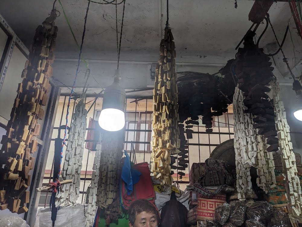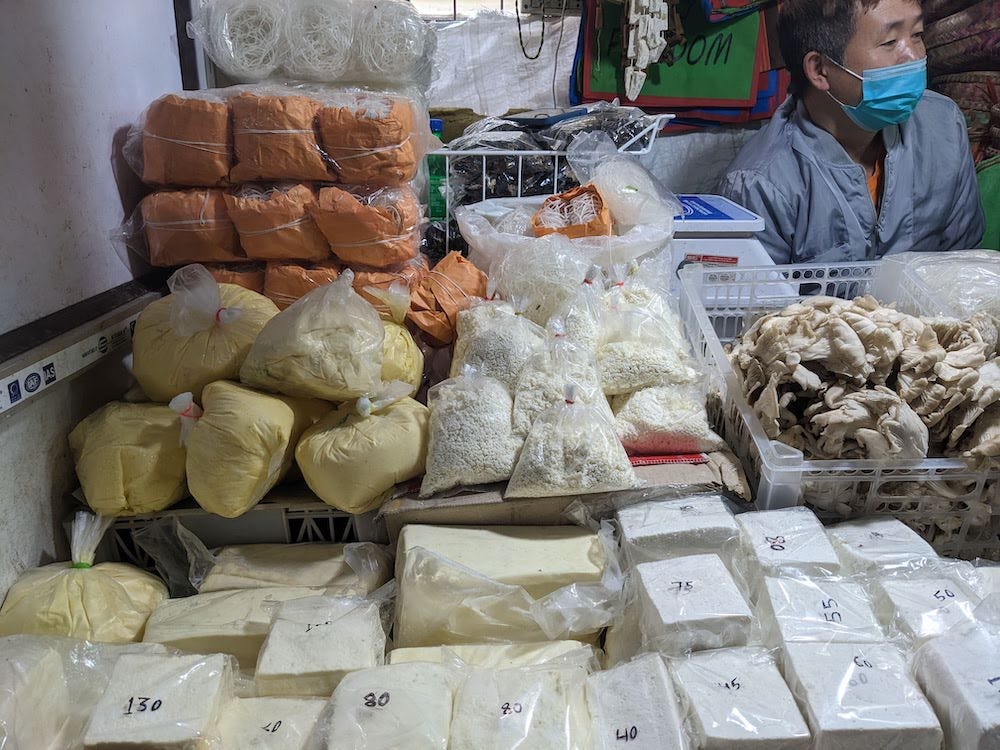 the smoky yak cheese, churpi, drying. This hardened cheese survives for years and was once shepherds’ main source of protein as they herded sheep and cattle on noman’s land. Now churpi is a popular dog treat in Western countries.