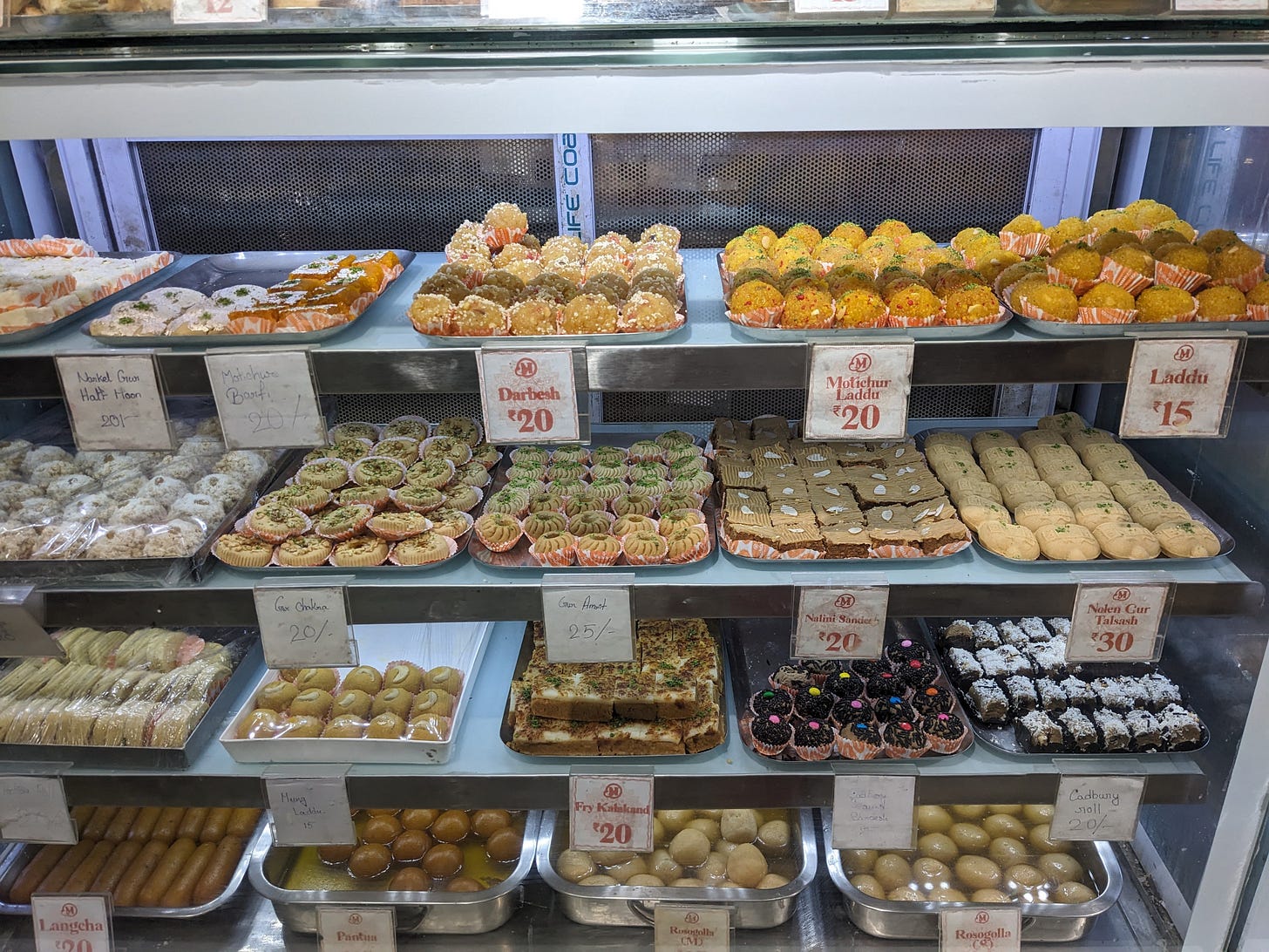 It was worth it, for I found two shops that had what I needed. One was a sweet shop right across from the junction where I got off. I had added ghee to my cart. This shop had the local Bengali ghee I had been wanting to try, and another local woman was buying it, giving me confidence. They also had all their sweets made from nolen gur, the date palm jaggery, the one I had been dying to try. I bought two Nolen jaggery sweets and 250 grams of ghee.