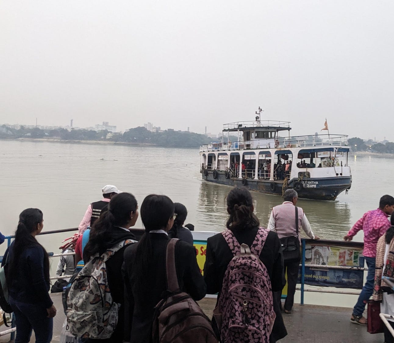 I walked out of the park from another exit. From the park, I followed the direction towards the East, towards the river Hooghly, to one of its shores called Babu Ghat. On the steps to the river, people were praying. Hooghly is another name for Ganga, and I forget this every day. I didn’t go down the steps; a lot of garbage was thrown around everywhere. Further ahead, signs for ferry tickets started popping up. Of course, the ferry! I had heard from my friends about ferries a few times. Until then they were things I had yet to explore in Calcutta. But that was going to change.