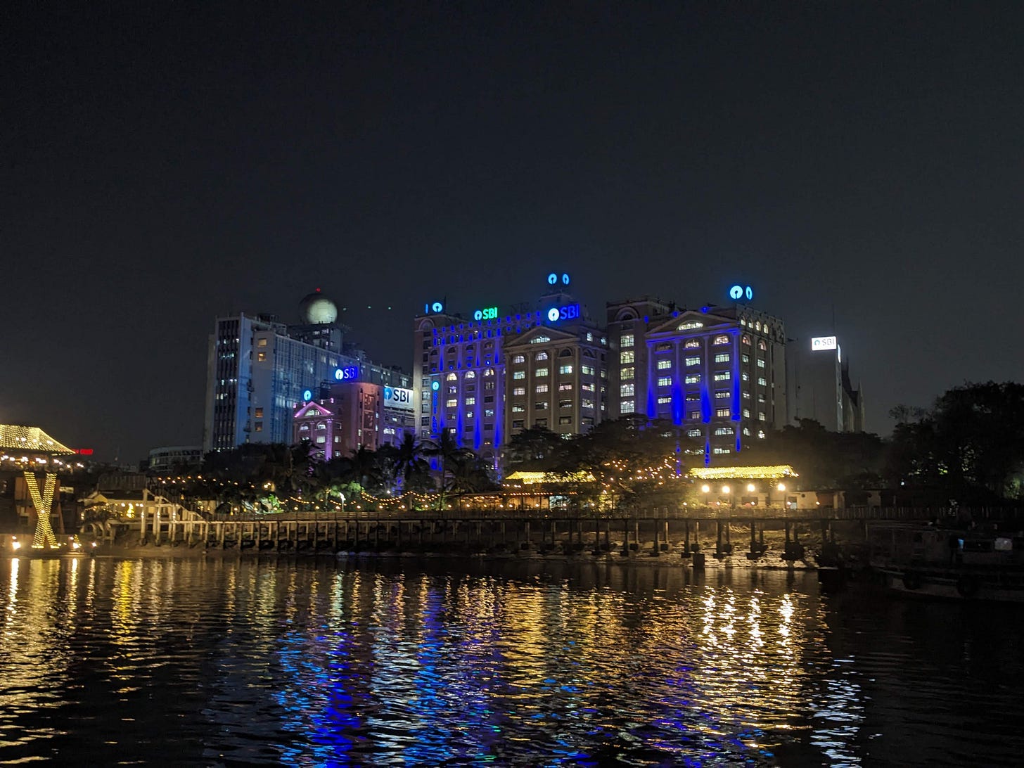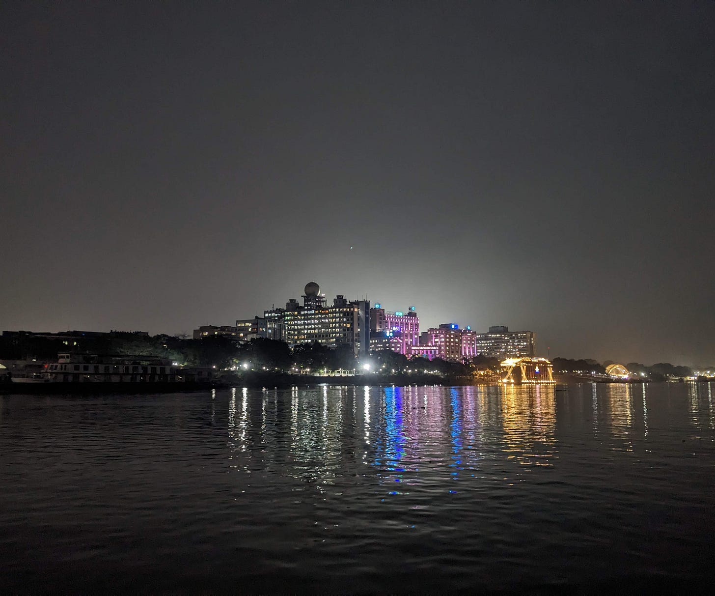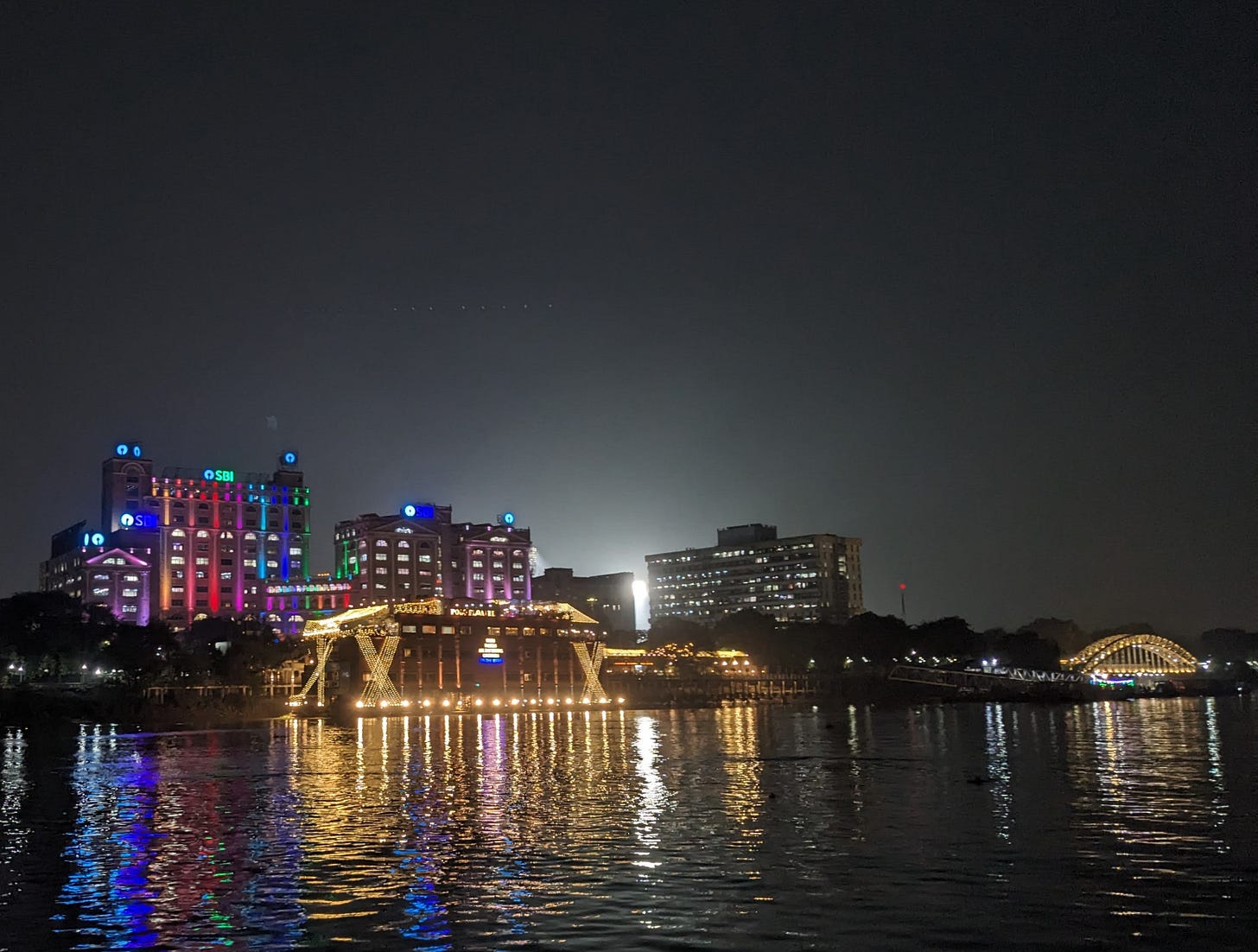 I was back at the ferry ticket centre. Amongst the two options, I went back to Babu Ghat. I stood on the ferry all the way, watching the river go by and the moon play hide and seek from behind the clouds. This time, the monolith of the SBI bank building on the shore was lit up, and so was the Howrah bridge. A floating hotel on the Ganga shone brightly, as if celebrating Diwali. A glowing arched bridge above Babu Ghat got my attention, too.