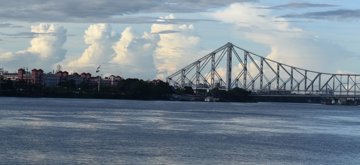 Howrah is a bridge. The Howrah Bridge is the sixth longest cantilever bridge in the world, third at the time of construction in 1942. Cantilever is a fancy word for me, so let me say that the Howrah Bridge is a floating bridge, with support only on its two ends. Every time I see the Howrah Bridge, I am amazed at how far we have come.